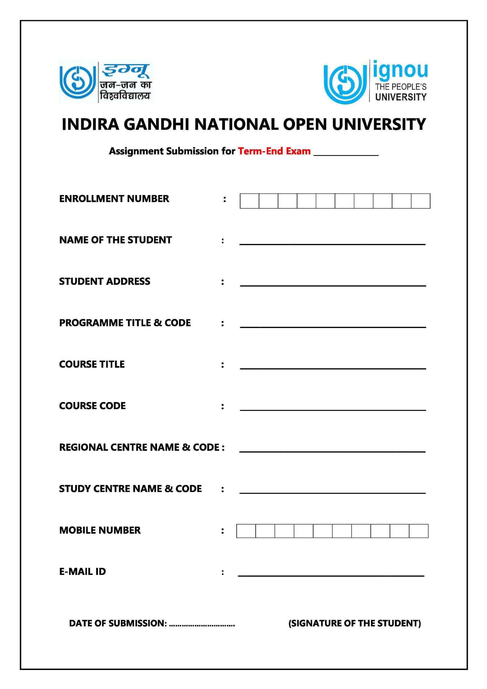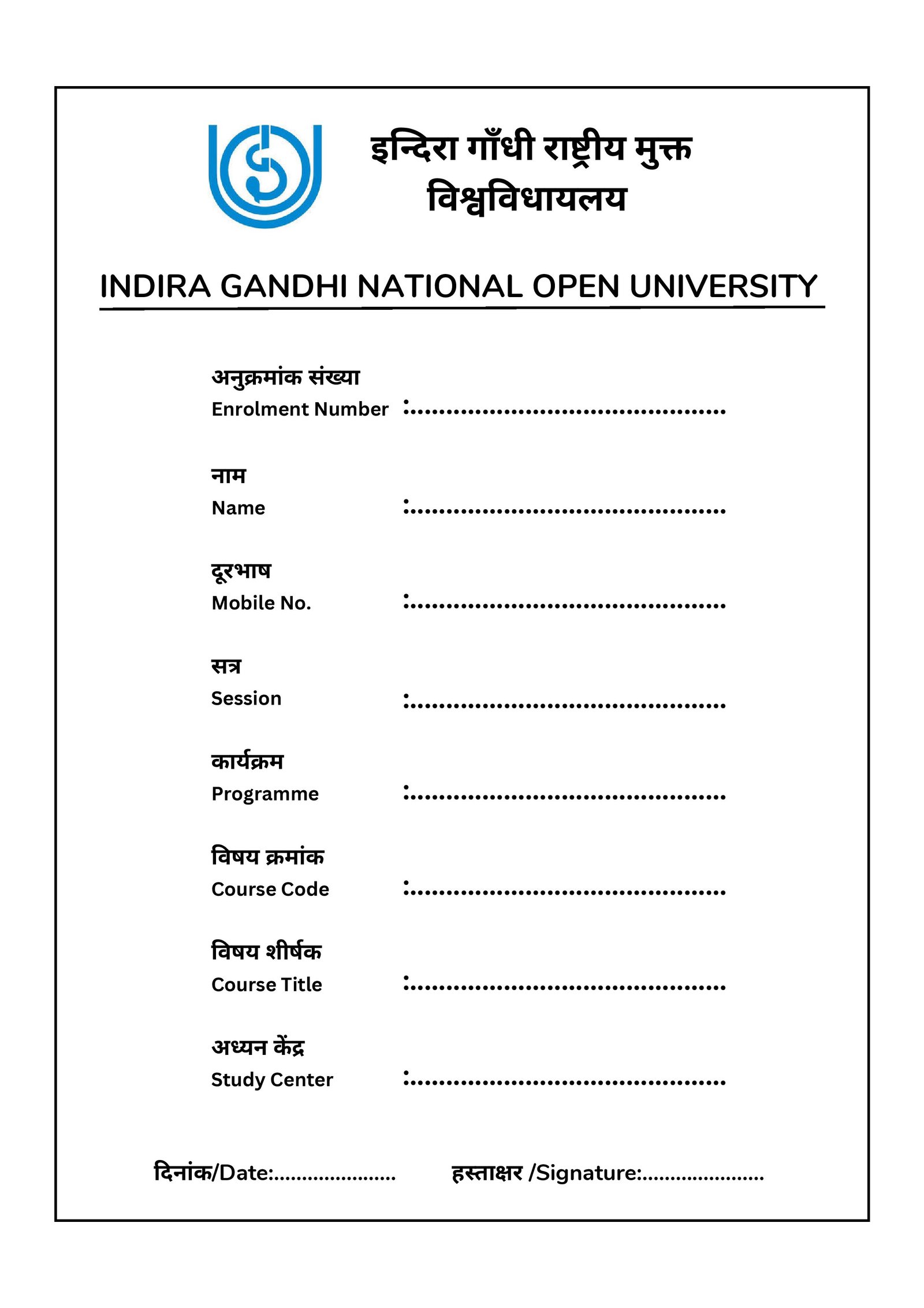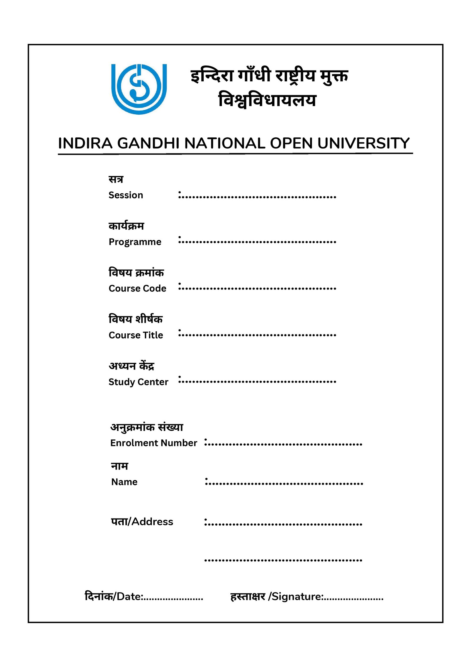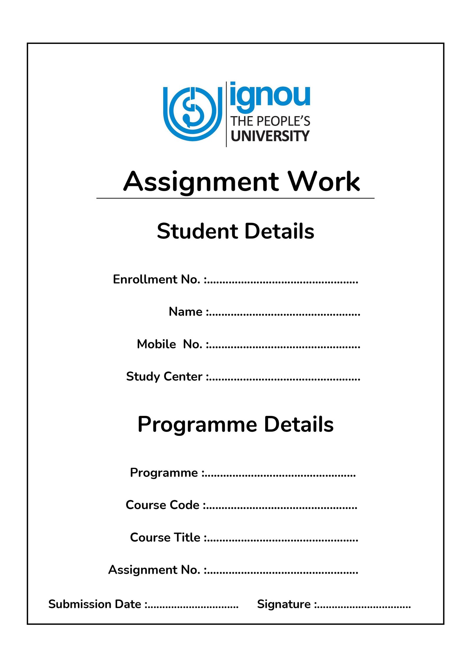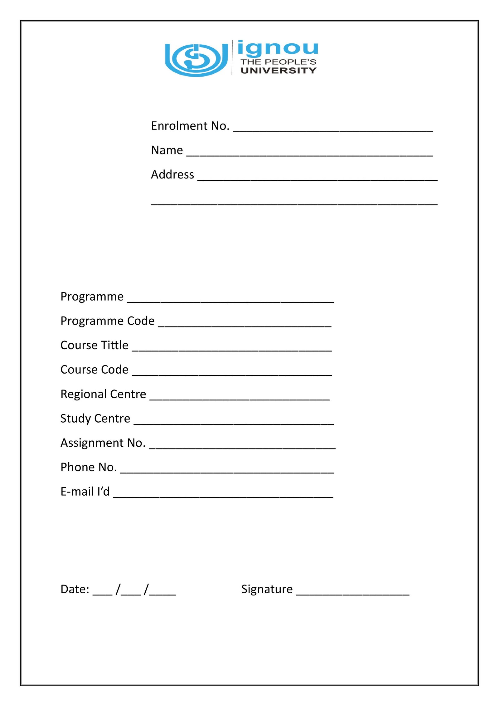 IGNOU Assignment Front Page/Cover Page – Download Front Page/Cover Page Formats (PDF)